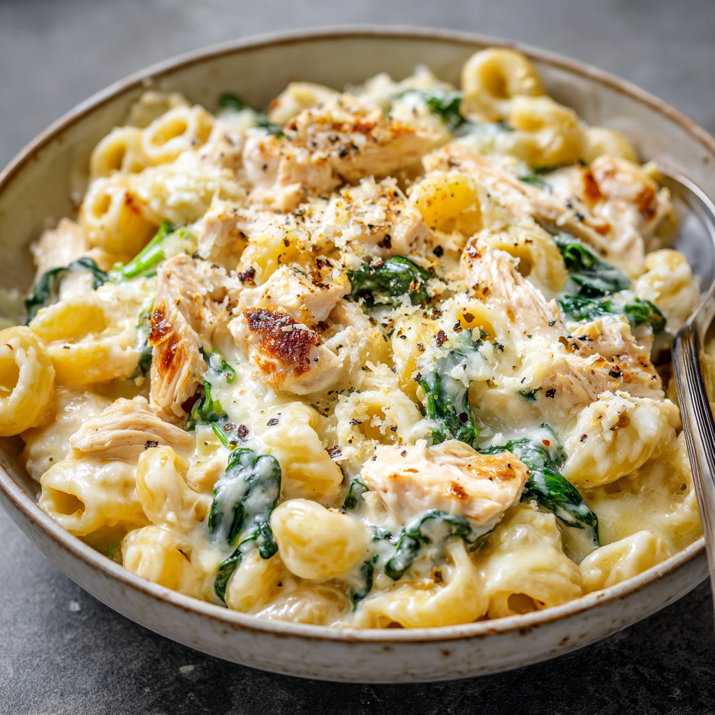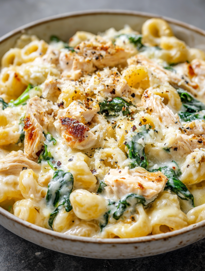 This dish is pure comfort food with a touch of freshness. Creamy Alfredo sauce meets rich mac and cheese, then gets a boost of tender chicken and baby spinach for balance. A blend of mozzarella and Parmesan makes it extra melty and luxurious, while the spinach adds color and lightness. It’s a cozy weeknight dinner that feels just a little special.