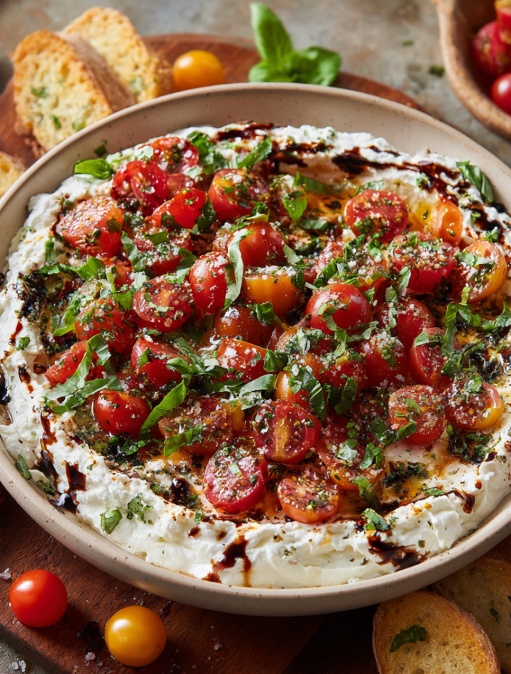 That’s where this dip comes in, like your coolest friend who always knows how to make things more fun. We’re taking all those sun-ripened, vibrant flavors you adore and transforming them into one spectacular, scoopable, shareable situation. Imagine a luxuriously creamy, herbed cheese base, piled high with a bright, confetti-like tomato and basil topping, and finished with a sexy drizzle of sweet-tangy balsamic glaze. You get every component of bruschetta in one glorious scoop. It’s fresh, it’s creamy, it’s tangy, and I promise you, it will be the first platter to empty at your next gathering. So, let’s ditch the stress and cook up some joy!