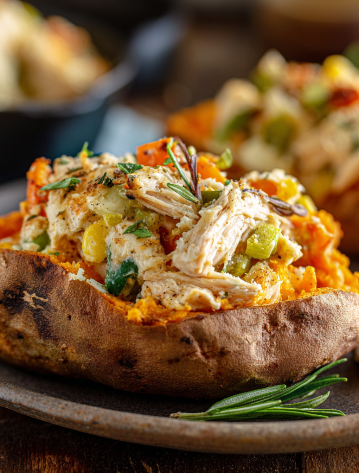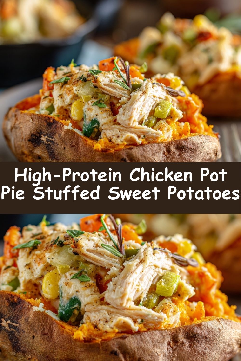 High-Protein Chicken Pot Pie Stuffed Sweet Potatoes
