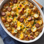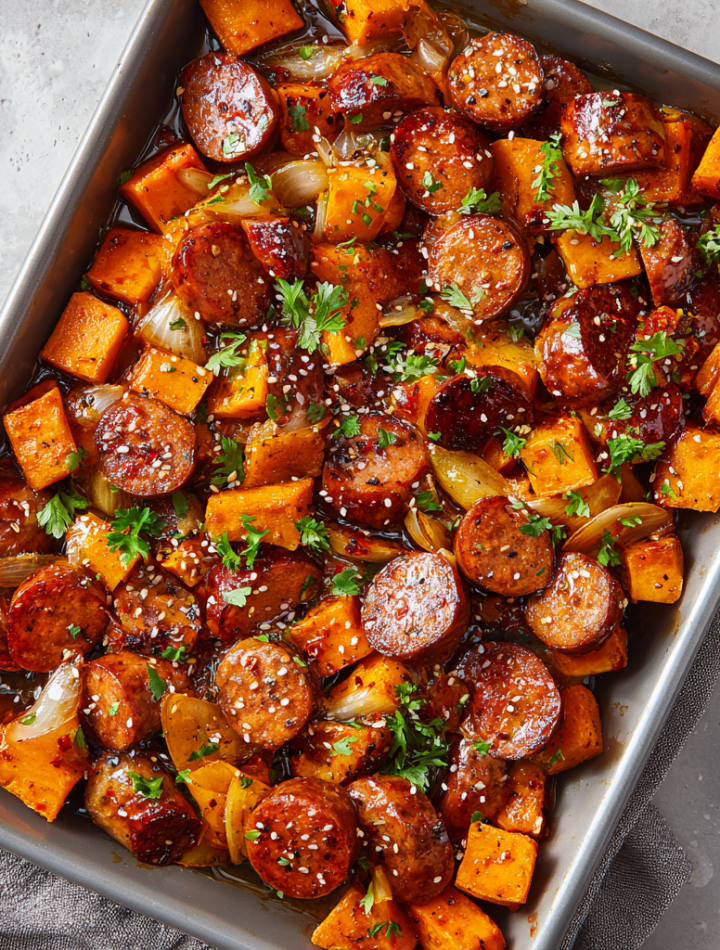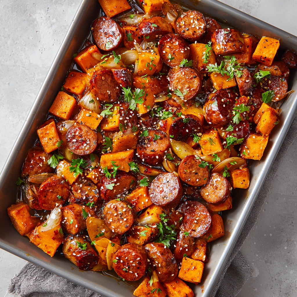 This hearty one-pan dish combines savory sausage and tender roasted sweet potatoes coated in a sticky, sweet-savory glaze. With a kick of paprika, garlic, and a splash of soy, it’s bold, satisfying, and perfect for cozy dinners. We’ve doubled the batch for families or meal prep — and added a twist of chili flakes and lemon zest for extra depth.