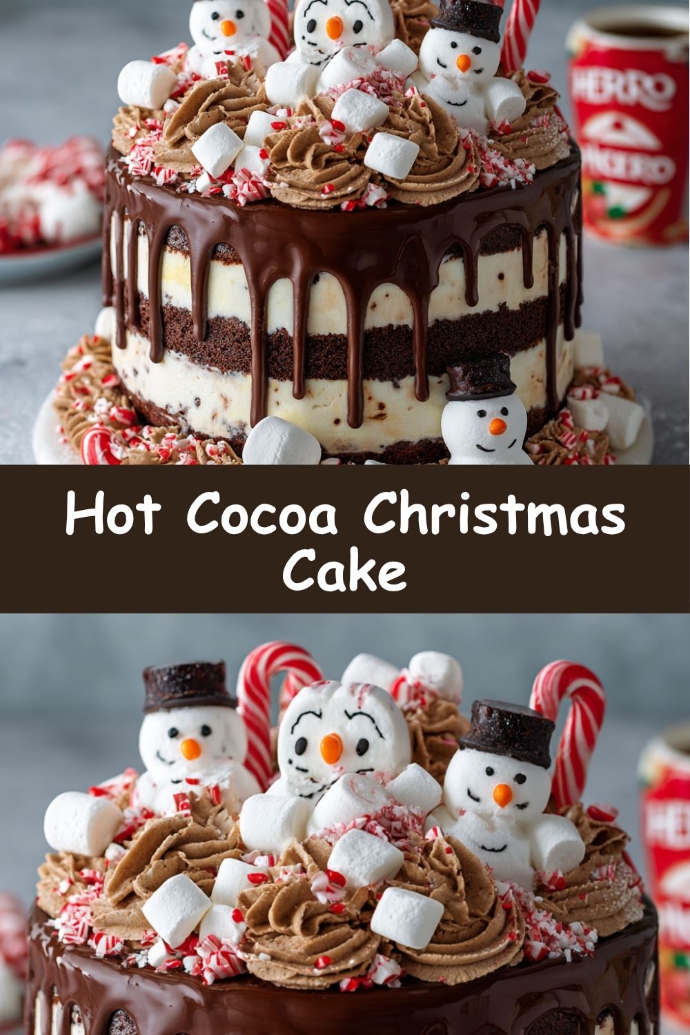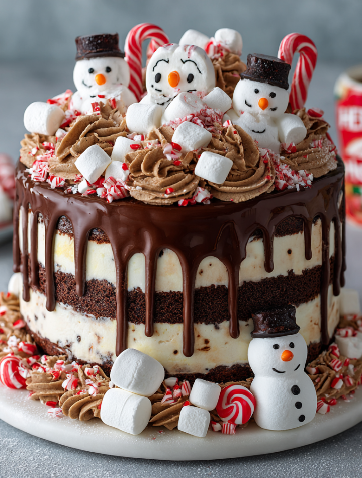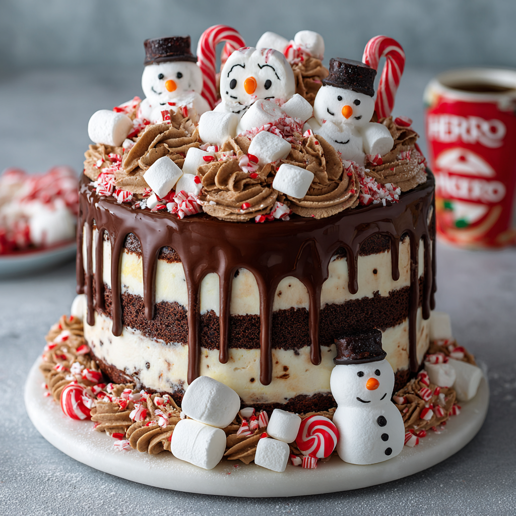 This stunning Christmas cake is inspired by everyone’s favorite winter drink—hot cocoa! Layers of moist chocolate cake are frosted with silky cocoa buttercream, topped with a glossy chocolate drip, and decorated with playful marshmallow “snowmen.” Crushed peppermint candies and mini candy canes add the perfect holiday crunch.