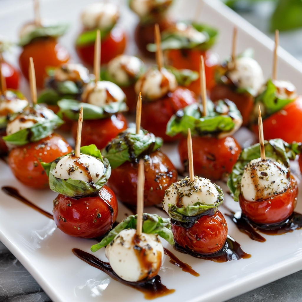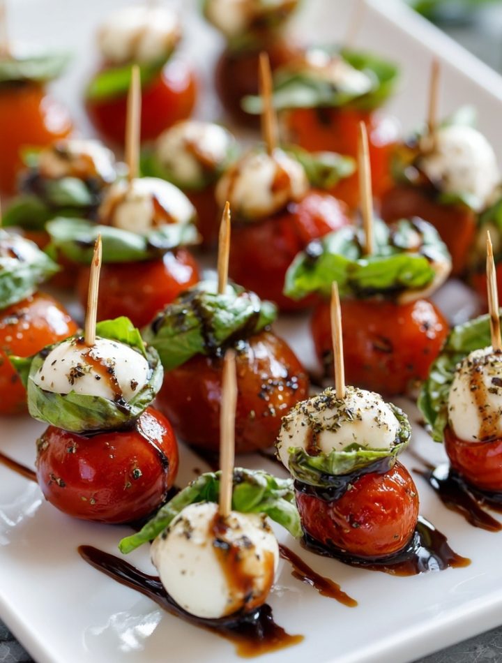 We’re taking the classic, beloved Caprese salad—a tricolor tribute to the Italian flag with its brilliant red tomatoes, snowy white mozzarella, and vibrant green basil—and turning it into the most adorable, poppable, one-hand-friendly appetizer you’ve ever seen. These little skewers are more than just food; they’re a experience. You get the sweet, juicy burst of a tomato, the luxurious, creamy give of fresh mozzarella, and the aromatic, almost peppery kiss of fresh basil, all tied together with a tangy-sweet balsamic glaze and a glug of golden olive oil.