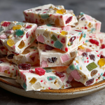 This chewy, colorful nougat candy is a throwback to the classic Brach’s version, packed with sweet white chocolate, fluffy marshmallows, and fruity gumdrops. It’s easy enough for beginners and festive enough to impress at any holiday table. Make a batch, slice it up, and share the joy—if you don’t eat it all first.
