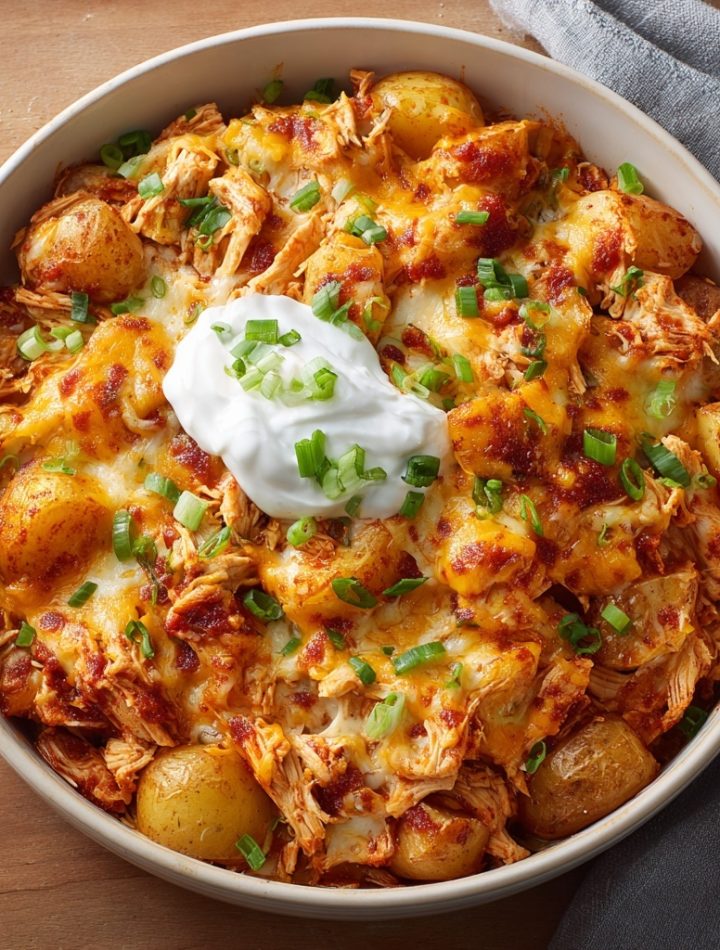 This one’s a triple win: BBQ flavor, creamy ranch goodness, and slow cooker ease—all baked into a hearty, family-friendly casserole. Tender shredded chicken simmers with ranch seasoning and BBQ sauce, then gets layered over soft, seasoned potatoes and topped with melty cheese. It’s comfort food that works just as well for a weeknight dinner as it does for meal prep.