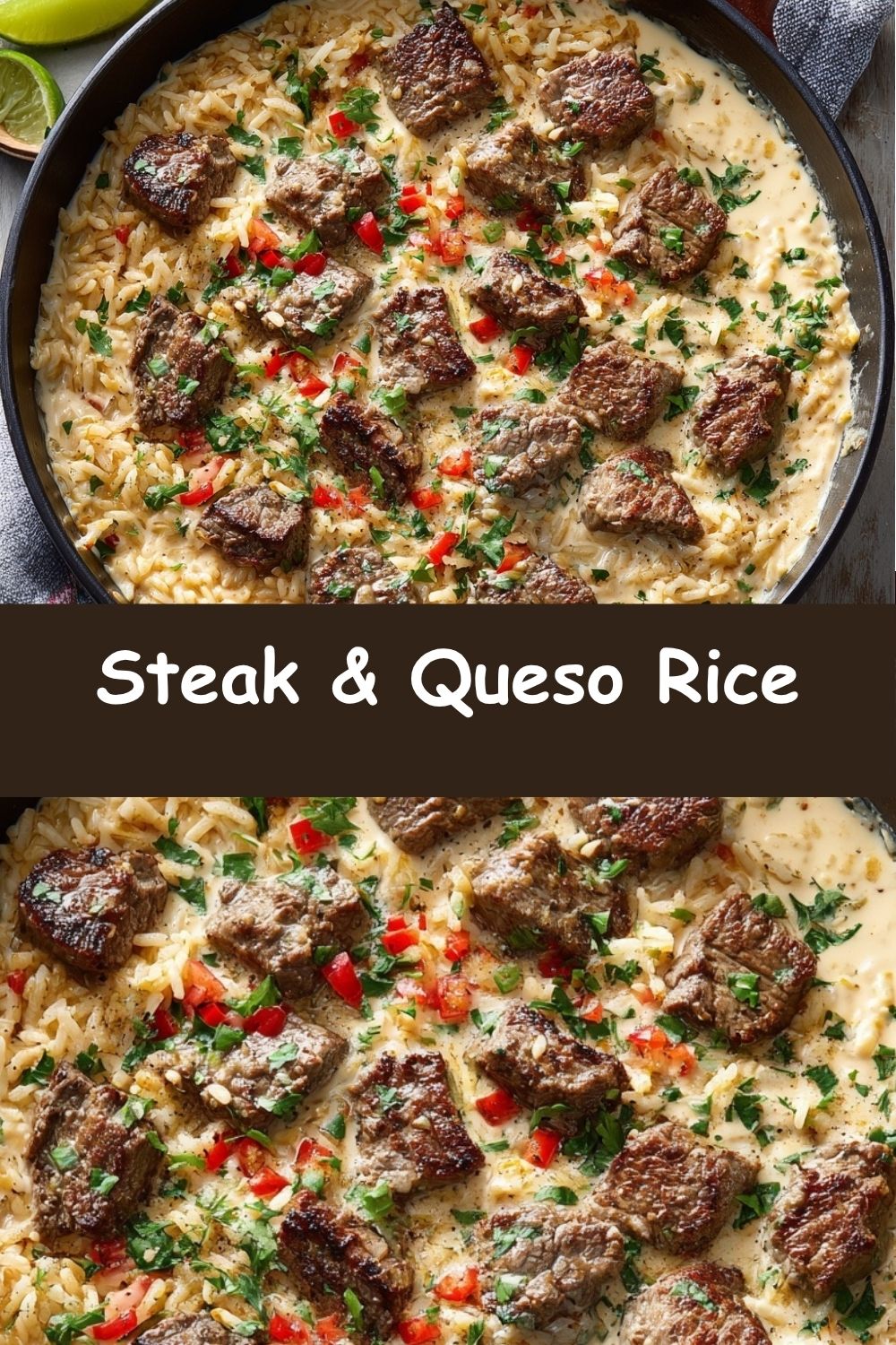 This is a dish that deserves a little fanfare! I love serving it family-style, right in the skillet I cooked it in—it’s rustic, beautiful, and means one less dish to wash. Grab some big bowls, spoon a generous helping of the Steak & Queso Rice into each one, and get ready for the finishing touches. A vibrant sprinkle of fresh chopped cilantro and a generous squeeze of fresh lime juice are non-negotiable for me. They add a pop of color and a zesty brightness that balances the rich, cheesy steak perfectly. Dinner is served!