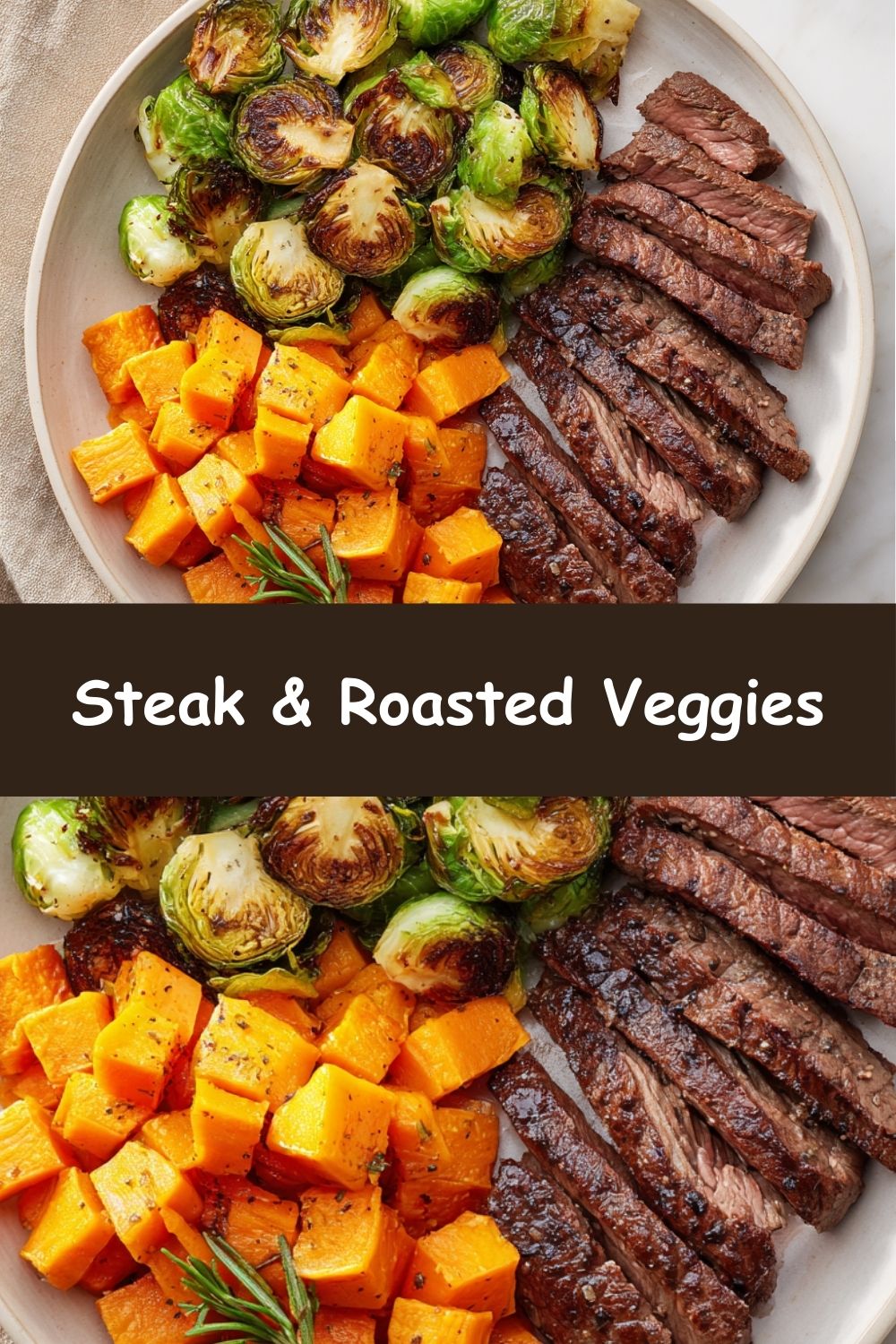 Cook Steak: While veggies roast, season steak with salt and pepper. Heat a skillet over high heat. Sear steak for 3–4 minutes per side (or to desired doneness). Let rest before slicing.