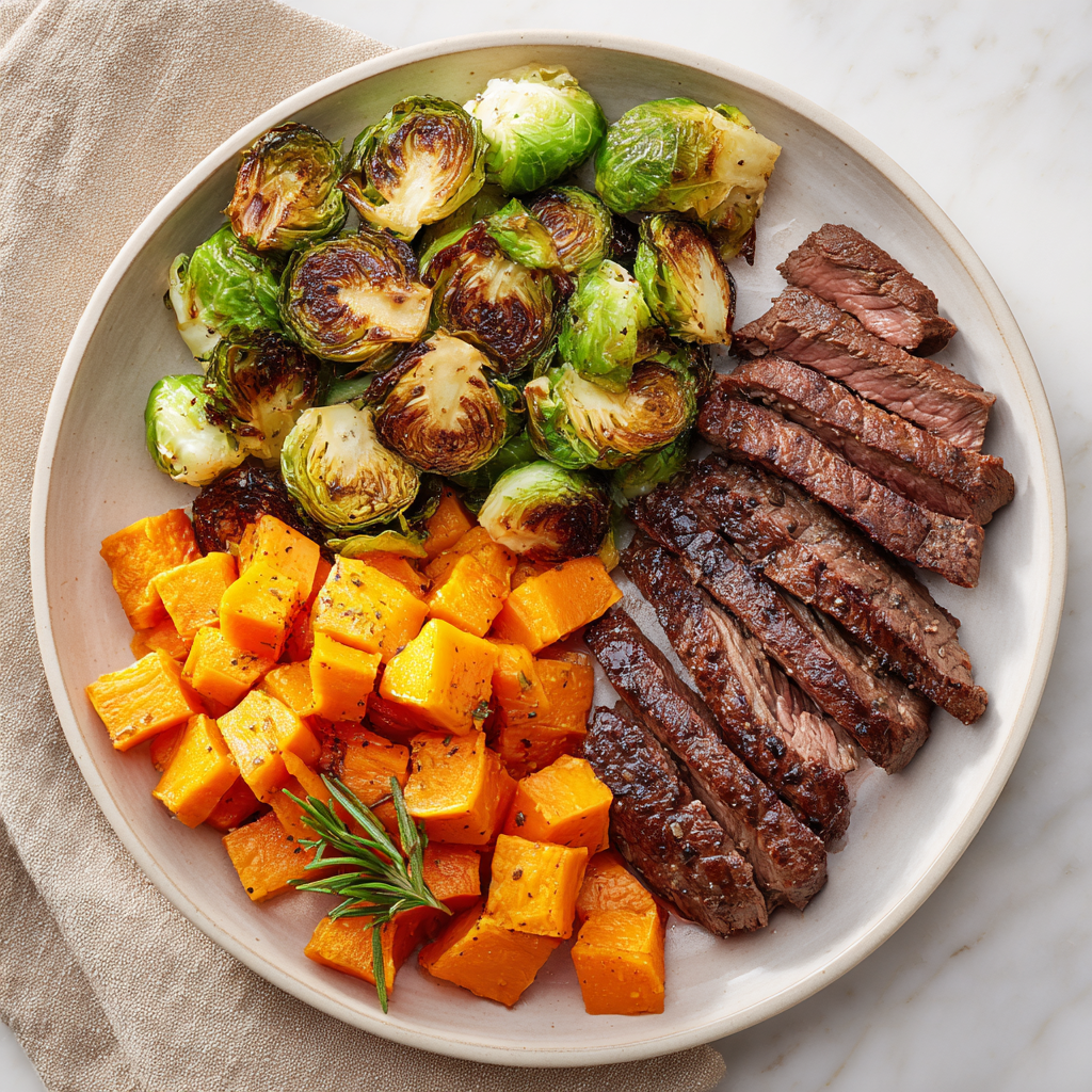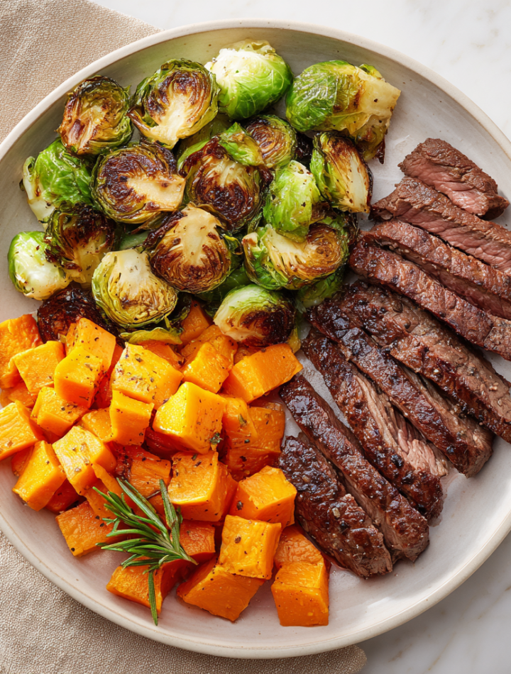 This protein-packed meal brings together juicy, pan-seared steak with caramelized roasted Brussels sprouts and sweet potatoes. It’s a balanced, hearty dish loaded with flavor and nutrients—perfect for fueling your day or impressing at dinner.