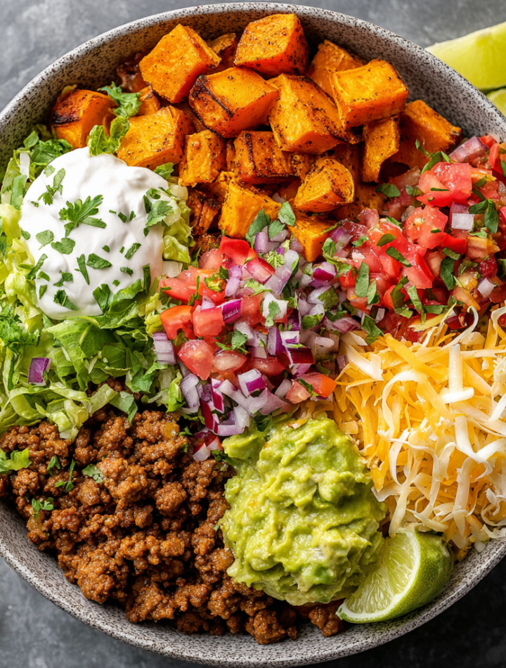 Looking for a weeknight dinner that’s both hearty and vibrant? These Sweet Potato Taco Bowls bring the fiesta with smoky roasted sweet potatoes, spiced taco beef (or vegan alternative), fresh toppings, and creamy extras—all piled high in one satisfying bowl. It’s the perfect mix of nutritious and indulgent, and it’s ready in under 40 minutes.