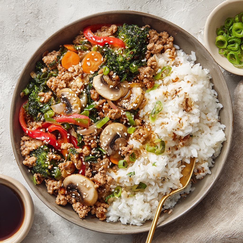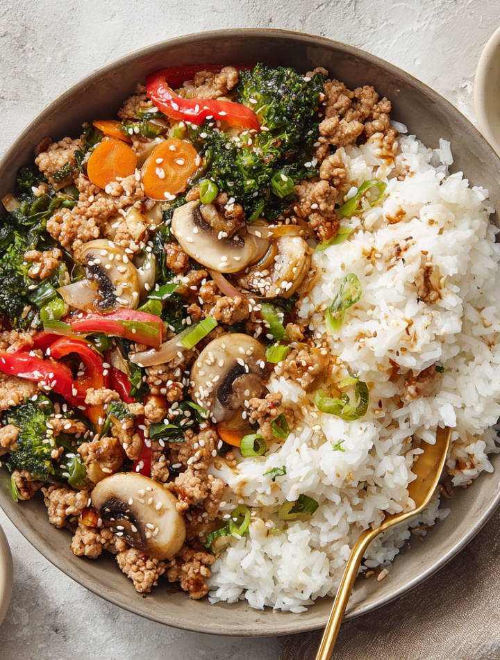 This upgraded version of the viral rice bowl delivers big flavor in every bite. Ground turkey, tender veggies, and a homemade sauce come together fast. We’ve doubled it for easy meal prep and added mushrooms and sesame oil for deeper flavor. Quick, hearty, and endlessly customizable.